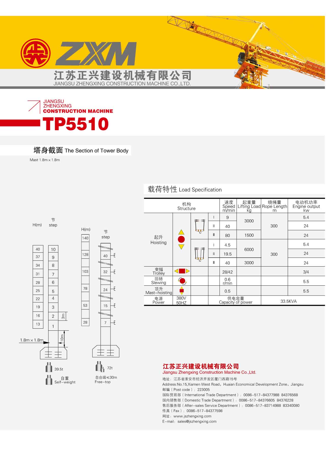 2、最大工作幅度55米,最大起重量6噸(dūn),額(é)定起重力矩630KN.M;